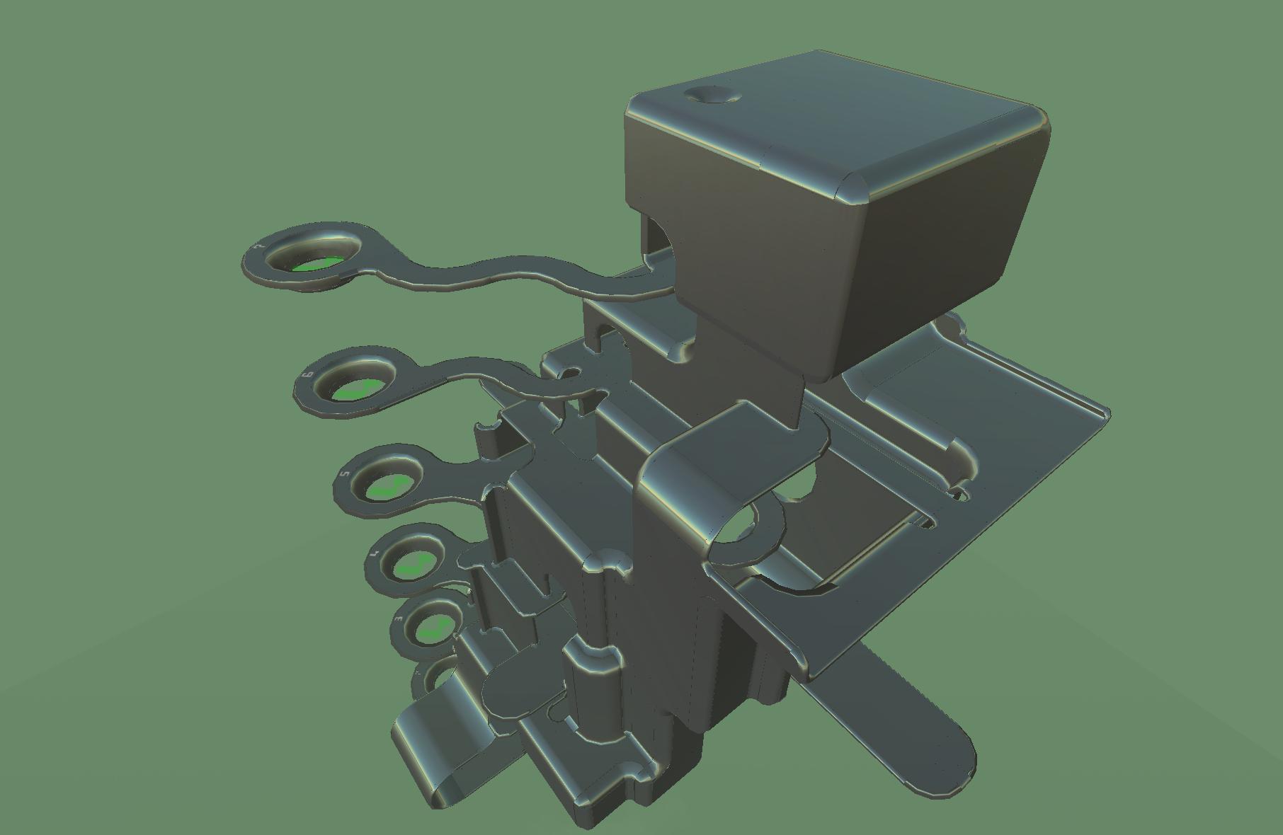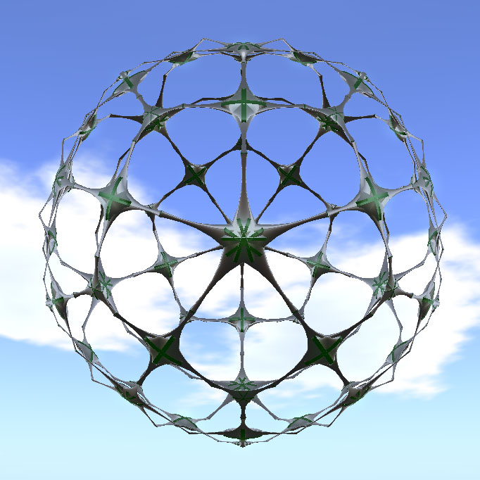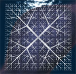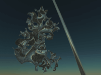 (Sep 2005) "Negative Curvature Fractal 4", another procedurally generated fractal. It has "negative curvature" in the sense that each piece is the inside curve of a torus, which has negative curvature. If it were possible to fit those pieces together smoothly then the entire surface would have negative curvature. As it is there are some angles, but it retains some features of negatively curved surfaces: it gets very crinkly as one moves out towards the edges of it.