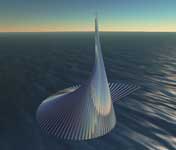 (Dec 2006) "Archimedean Spire". This is a ruled surface, that is a surface made up of straight lines. The ends at the base of the sculpture follow an Archimedean spiral, the other ends just move up the spire at a constant rate.